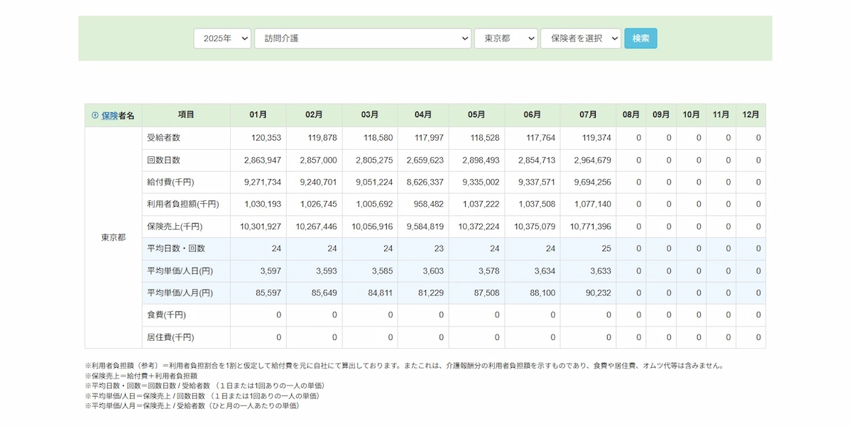 厚労省の最新データ2025年7月分を取込み、ウェルケアのサイトへ反映を完了しております。貴事業所との比較や諸々の検証等にご利用ください。
